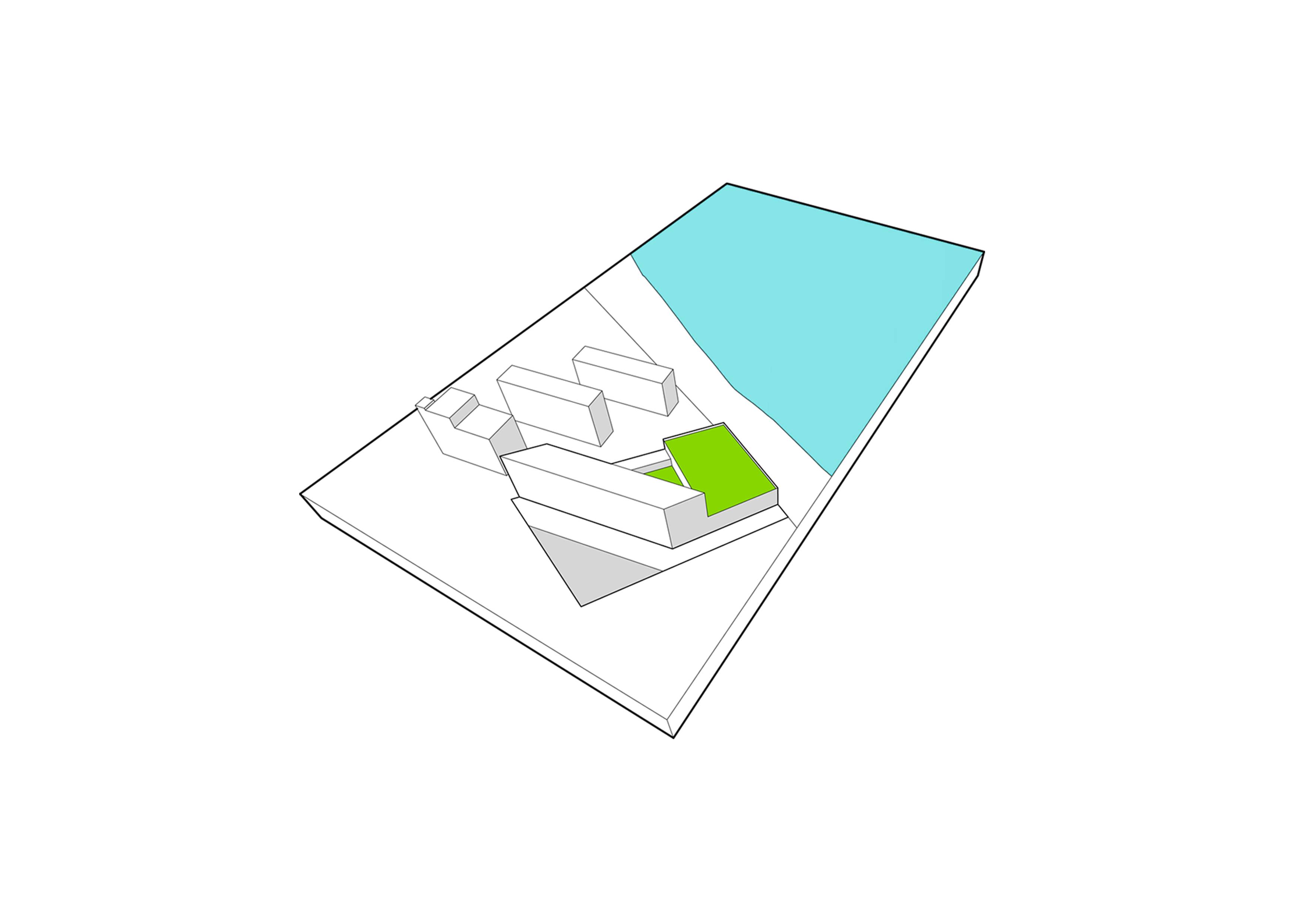 Część nowoprojektowanego budynku, w której znajdują się pokoje studenckie, nawiązuje wysokością oraz orientacją północ-południe do sąsiedniej zabudowy mieszkalnej. Jest to również najbardziej optymalne usytuowanie dla budynku mieszkalnego w tej szerokości geograficznej, unikające pokoi z oknami zwróconymi na południe. Niższa część natomiast, usytuowana jest równolegle do linii brzegowej, próbując porządkować zabudowę od strony morza. Stanowi swoisty waterfront i wyznacza jego linię dla zabudowy, która powstanie w przyszłości na południe od projektowanego obiektu. Jest to projektowa odpowiedz na wielki problem plaż w całej Hiszpanii, którym jest chaotyczna, złej jakości zabudowa wzdłuż linii brzegowych. Znajdujący się na dachu tej części bardzo duży taras, daje studentom dodatkową możliwość relaksu oraz obserwowania morza z nowej perspektywy.