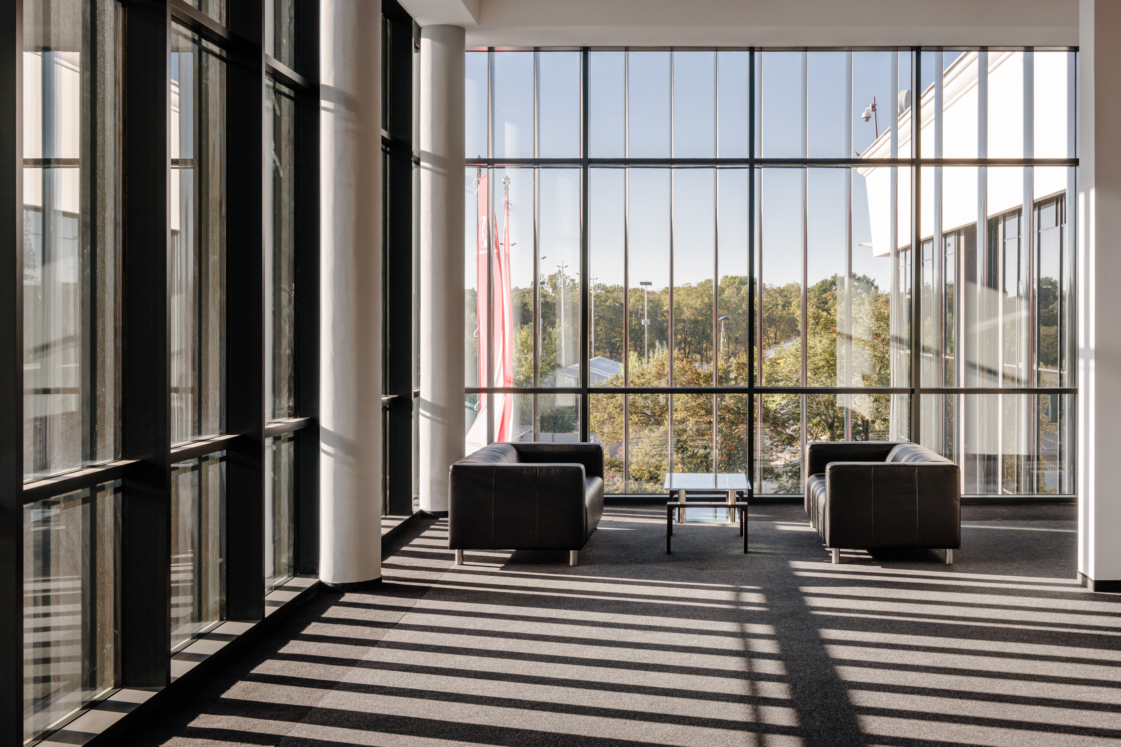 Poniżej zdjęcia z początku lat 90-tych.Z końcem lat 90-tych XX wieku obiekt został zmodernizowany ponownie – wykonano pełne zadaszenie wnętrza w oparciu o konstrukcje stalowych wiązarów i dobudowano od strony południowej rozbudowany architektoniczne blok pełniący funkcję biurowo-recepcyjną, a także nieco mniejszą przybudówkę od strony północnej, zasłaniającą częściowo portyk. Niższą część budynku oblicowano cegłą klinkierową.